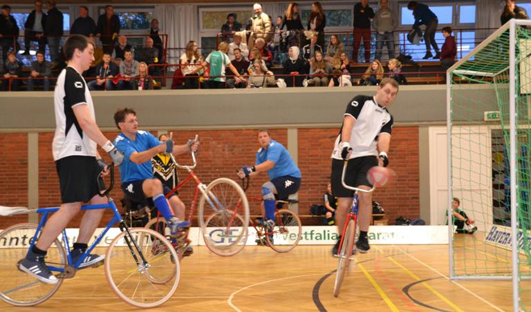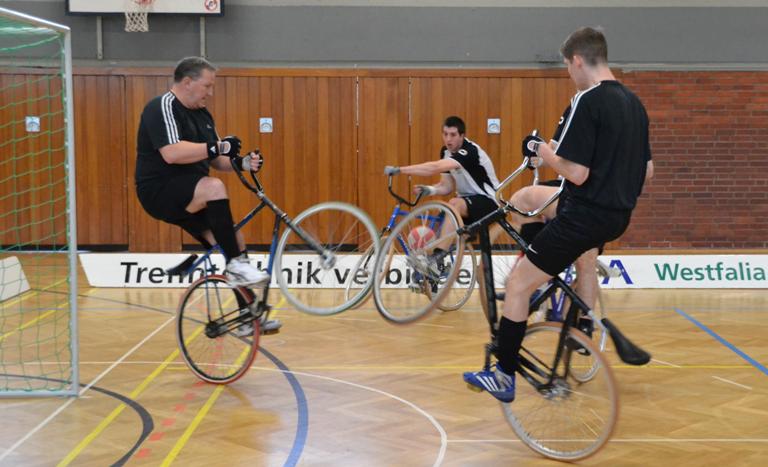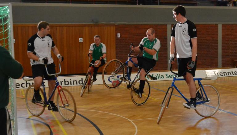 Um auch diesem eigenen Nachwuchs eine Auftrittsmöglichkeit einzuräumen, durften die Mädels und Frauen die Pausen zwischen den Spieleblöcken gestalten. Bis auf die Radball-Hörner-Lenker, den großen Sattel und die Stand-Dorne an den Radachsen , sind die Sporträder nahezu identisch. Und doch ergab sich ein Kontrastprogramm. Während beim Radball stets der Kampf um den Ball, die Seegraskugel, vorherrscht und da auch schon mal die Speichen krachen, werden die Kunstfahr- Übungen mit schöner Begleitmusik untermalt und zeichnen sich eher durch Akrobatik aus. Da waren auch die Einsteiger- Übungen der Jüngsten schon gut anzuschauen, die Maren Minuth und Katharina Fischer vorführten. Ein Reigen-Programm zeigten dann Kimberley Lautenbach, Nicole Overbeck, Julia und Andrea Vennewald. Dabei kam es dann auf die Synchronität der Fahrfiguren an.