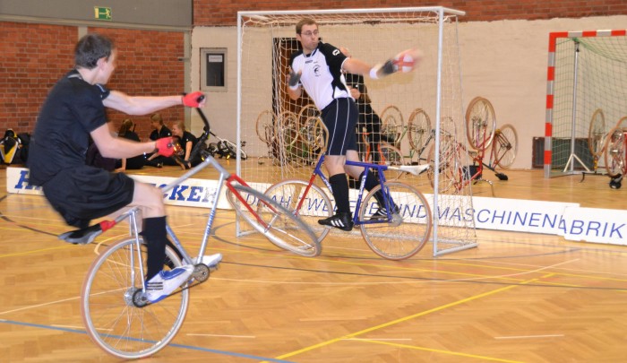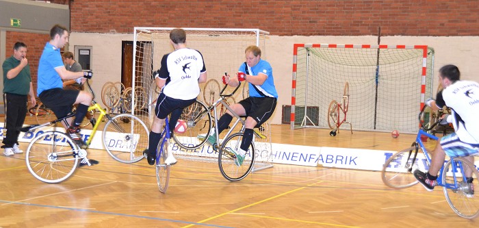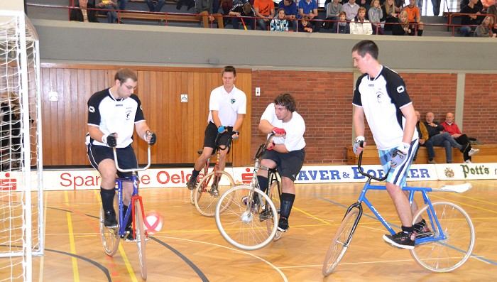 | Nach dem eher holprigen Verlauf der Turniervorbereitung gelang am Samstagnachmittag in der Olympiahalle ein erstklassiges Hallenradsport- Ereignis. Die Oelder „Radball-Schwalben“ hatten zum 47.Traditionsturnier geladen und selber die beiden Verbandsliga- Teams ins Rennen geschickt: Oelde 1 mit Stefan Voßhans und Sebastian Averbeck sowie Oelde 2 mit Matthias Voßhans / Timo Tillmann. Aus Iserlohn reisten zwei Mannschaften an: Hellgermann / Tönjann und Perla / Quittmann. Aus St.Hubert waren Boemanns / Konnen mit dabei. Zunächst vermisst wurden dann Marx / Tigges aus Suderwich. Diese hatten sich gemäß Google-Suche auf den Weg gemacht. Gibt man in das PC-Programm „Olympiahalle Oelde“ ein, so wird man zur Berliner Straße in Ennigerloh geleitet. Nach der Kurskorrektur „Zur Axt 36, Oelde“ konnte es losgehen. |
