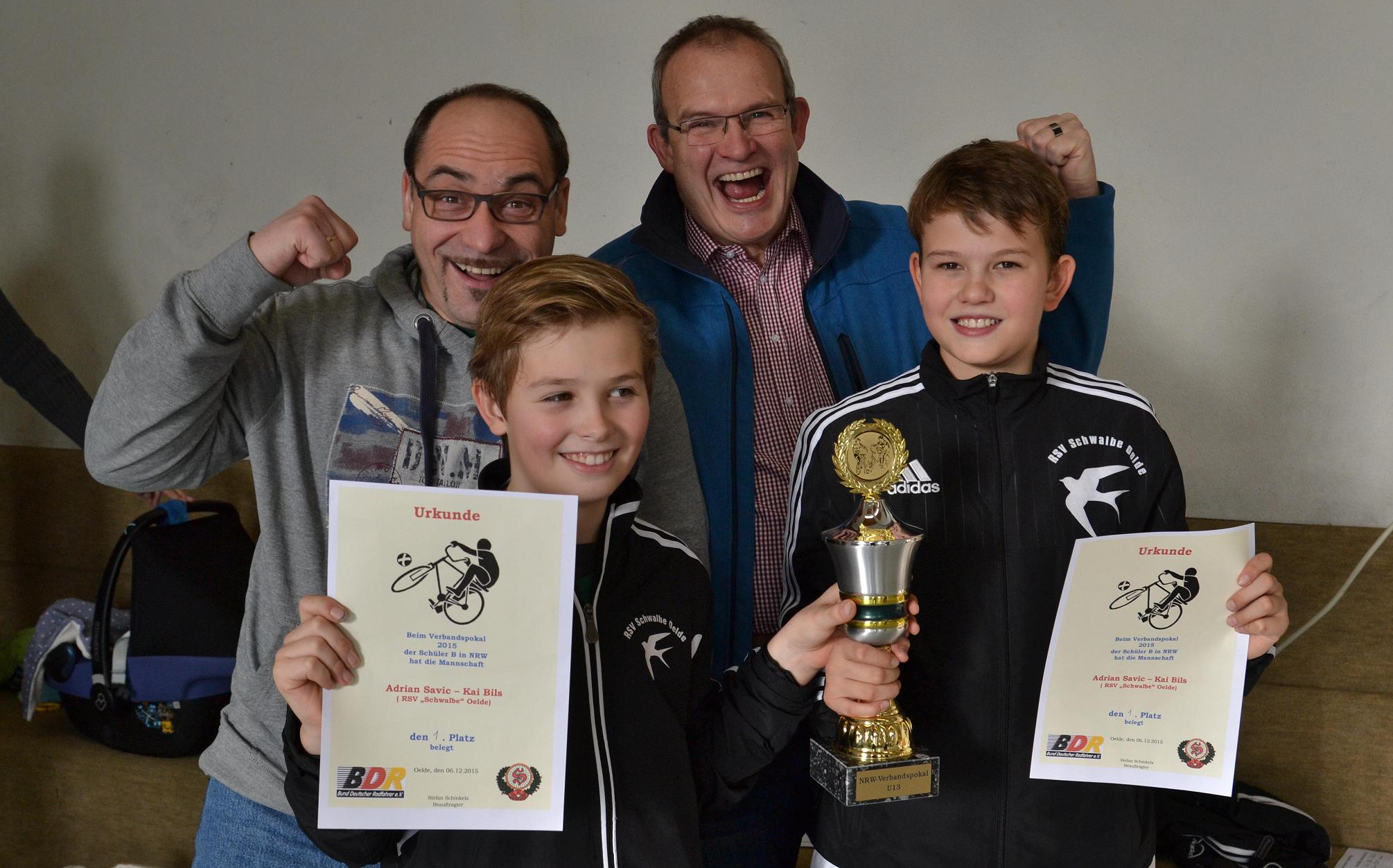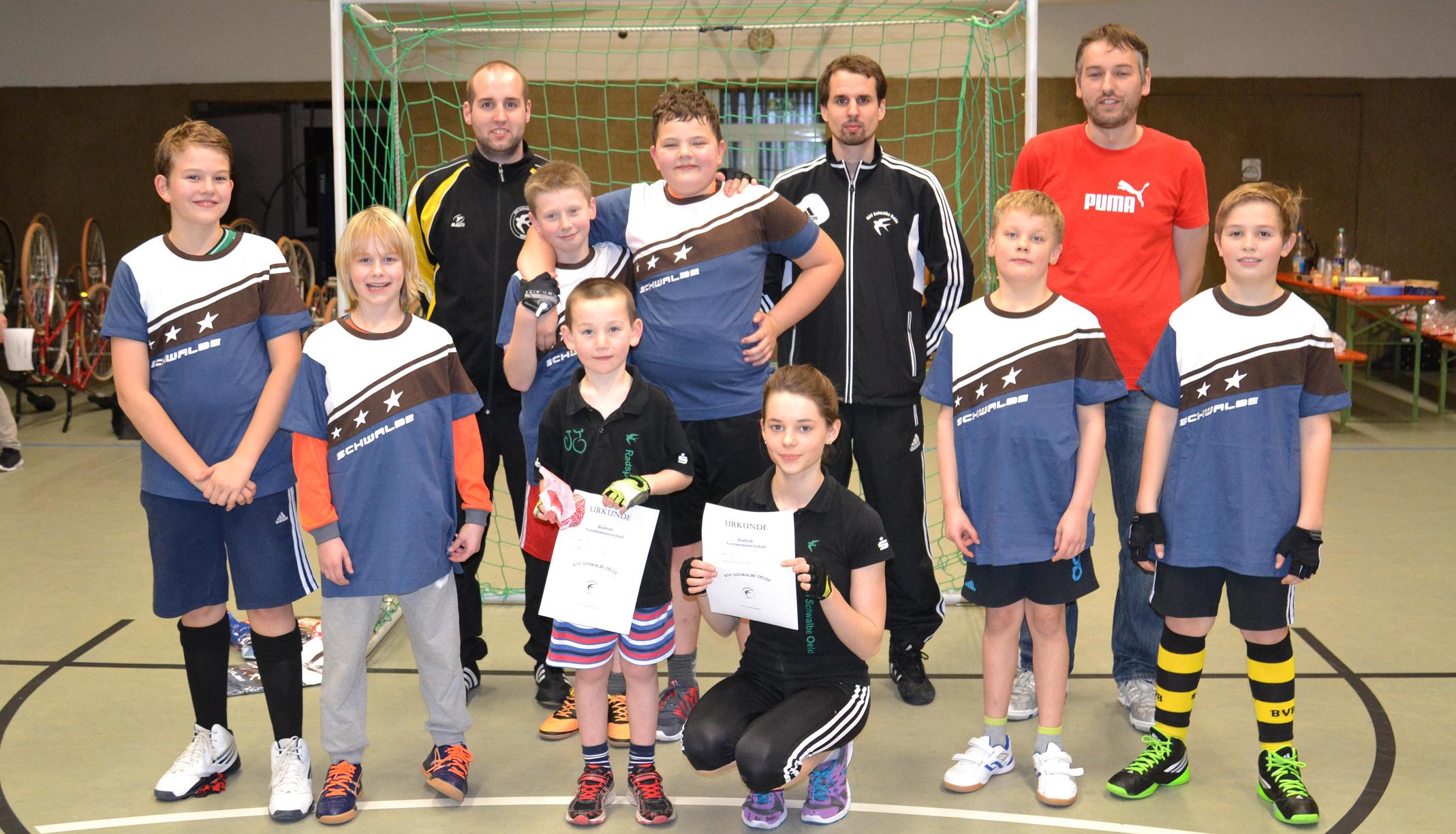 Batzdorfer / Lakenbrink hatte in diesem Jahr noch keine Sieg-Chance und landeten auf den vierten Platz. Mit einem Sieg kamen Savic / Prangemeier auf Platz drei. Bils / Pollmeier und Overbeck / Holtermann spielten um die Meisterschaft. Sie hatten beide schon zwei Siege eingefahren. Die entscheidende Partie ging nach nervenaufreibendem hin und her mit 1:0 Toren an die Mannschaft Groß und Klein, Overbeck / Holtermann, die damit auch Schüler-Vereinsmeister 2015 wurden. Die alt-ehrwürdige Halle an der Overbergstraße erlebte so eine ausgelassene und fröhliche Schwalben-Weihnachts-Party. Als Geschenke gab es noch Batzdorfer-T-Shirts für alle Kinder.