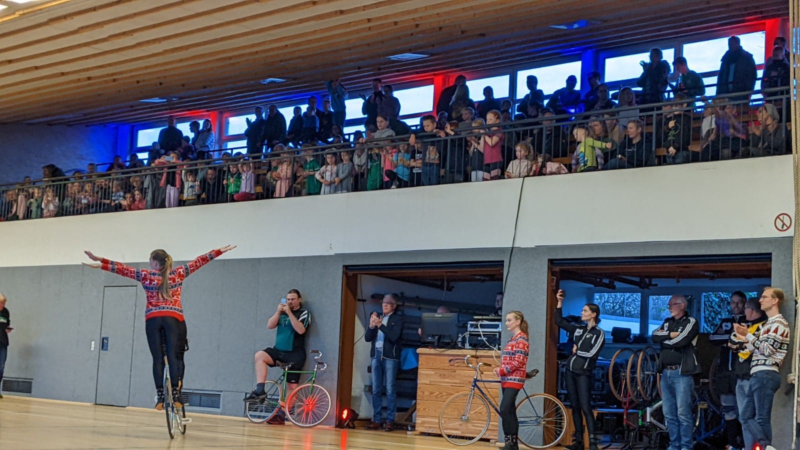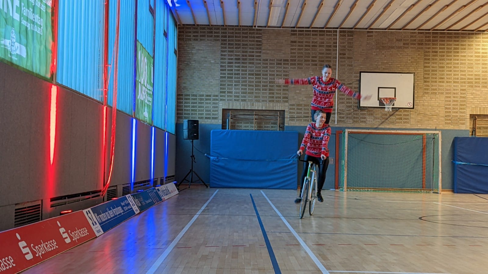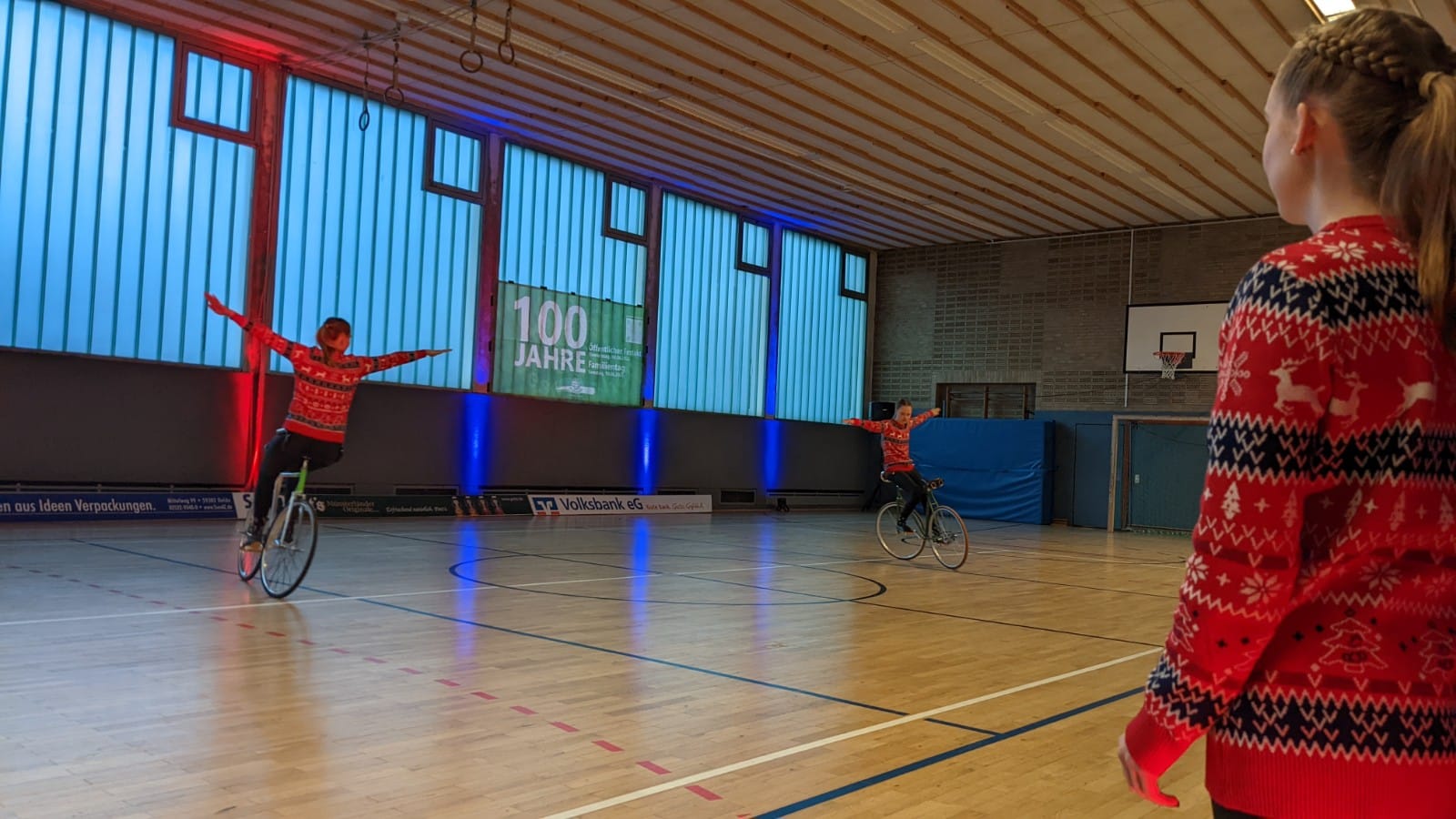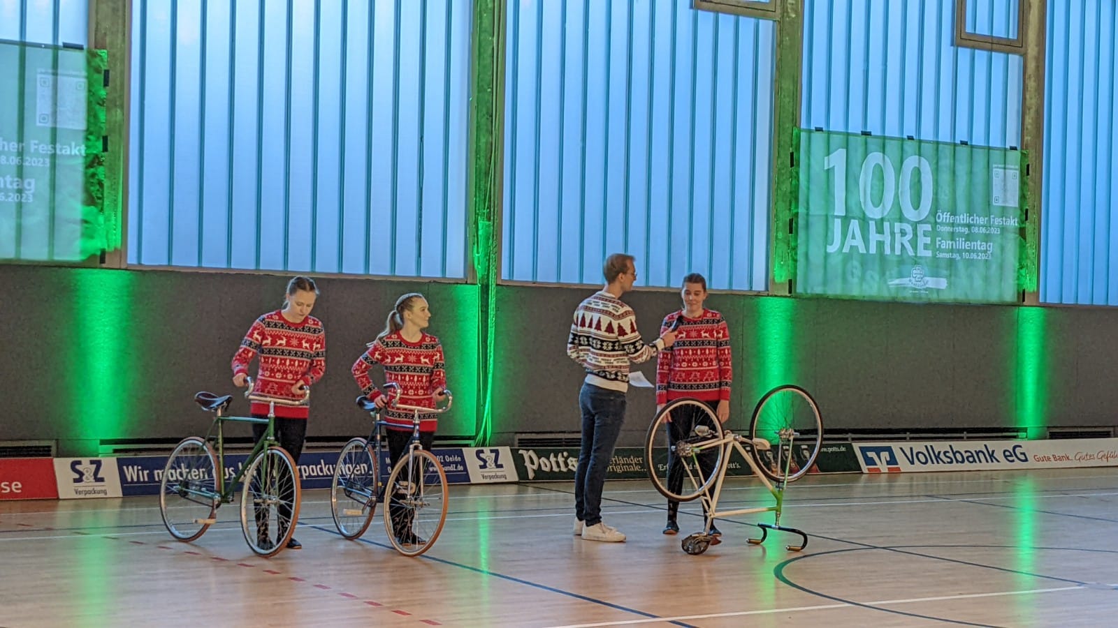 Ruhiger ging es beim zweiten Auftritt, dem Kunstradfahren, zu. Drei Elitesportlerinnen des RSV Schwalbe zeigten eine weihnachtliche Kombination aus Einzel-, Doppel- und Gruppenfahren. Zu den Klängen von "Last Christmas" und "Winter Wonderland" habe man spektakuläre Figuren auf die Bühne gebracht, die das Publikum hätten staunen lassen, teilt der RSV mit.