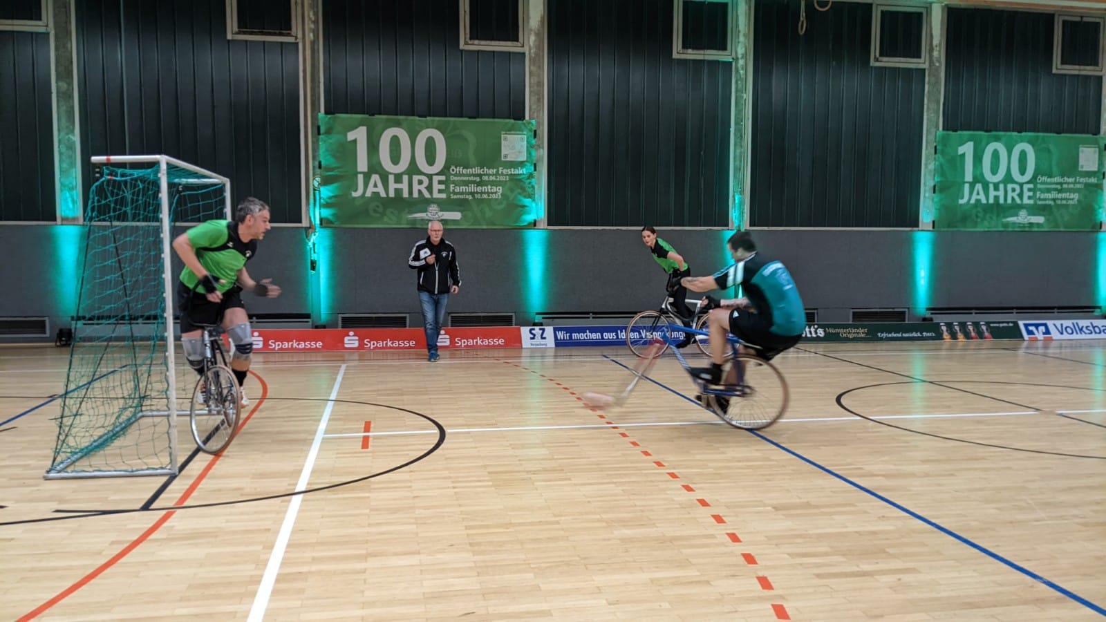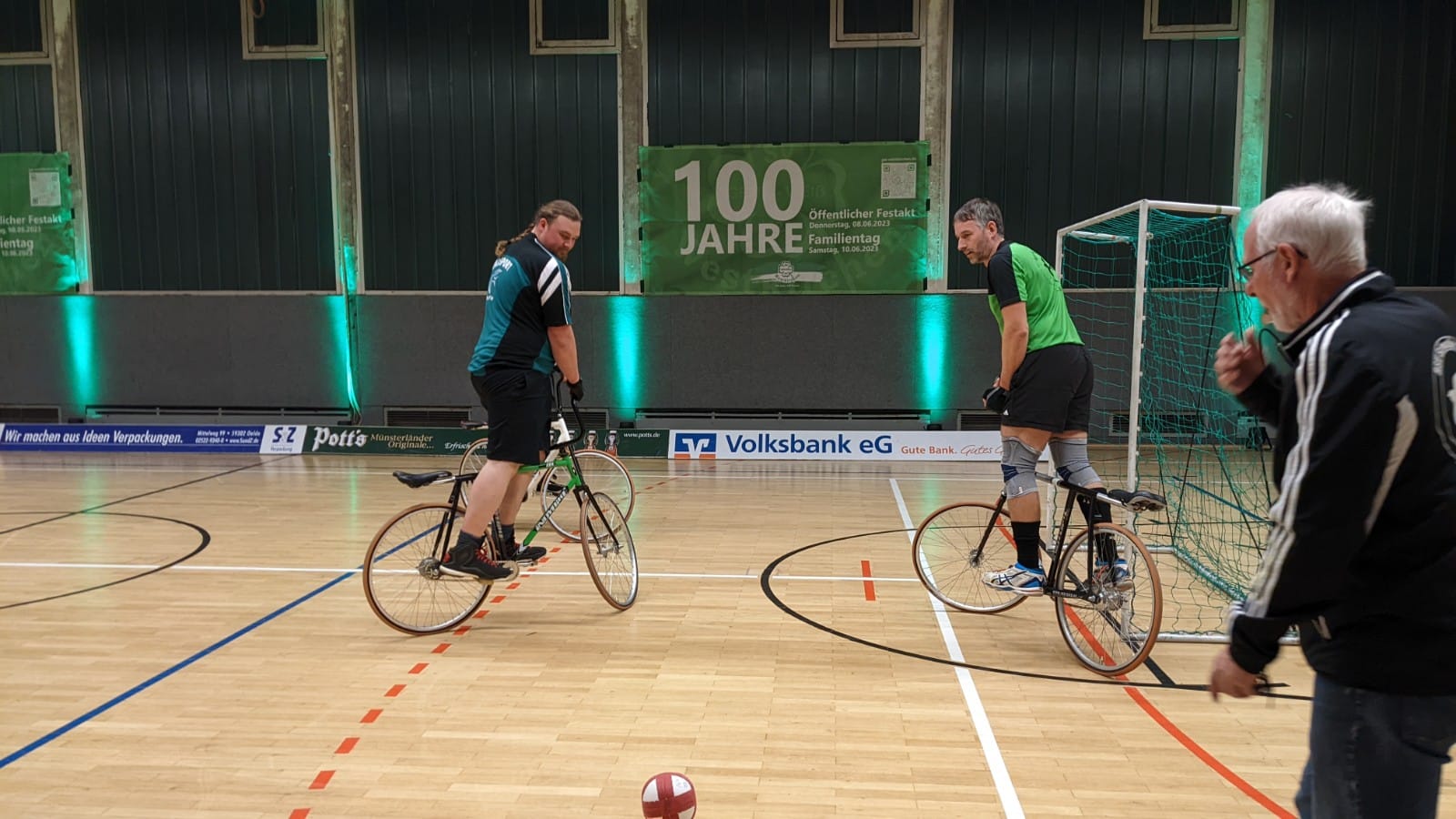Sieben Radballerinnen und Radballer sowie drei Kunstradfahrerinnen des Radsportvereins Schwalbe Oelde sind zusammen mit ihrem Vorsitzenden Steffen Vollenkemper Gäste von Grün-Weiß Westkirchen gewesen. Aus der Abteilung Radball präsentierten die Schwalben außer den verschiedenen Fahrtechniken und Tricks auf dem Radballrad auch ein klassisches Radballspiel. Dabei zeigten die Mannschaften dem RSV zu folge ihr Können. So sei die Seegraskugel mehrmals gekonnt und unter tosendem Applaus in das Tor befördert worden.